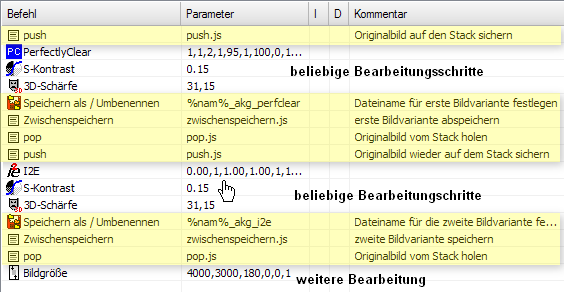 Normalerweise wird eine Stapelverarbeitung auf jedes der ausgewählten Bilder genau einmal angewandt, das Ergebnis wird gespeichert. D. h. es gibt für jedes Bild genau ein Resultat. Mithilfe einiger Booststripte könne jedoch in einem Rutsch mehrerer Varianten von ein und demselben Bild erzeugt werden. In einem zweiten Arbeitsschritt können die erstellten Varianten dann z.B. verglichen und das jeweils bessere Bild kann ausgewählt werden.