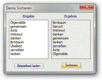 Mit dem folgenden Skriptbeispiel wird ein Dialog aufgerufen, der die Eingabe beliebiger Texte erlaubt, bzw. wo man über einen Button einen Beispieltext aufrufen kann. Nach Mausklick auf "Sortieren" werden diese Texte im Ergebnisfenster sortiert angezeigt.
